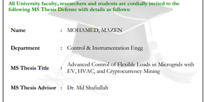 CIE Dept. invites all faculty, researchers, and students to MS Thesis Defense on "Advanced Control of Flexible Loads in Microgrids with EV, HVAC, and Cryptocurrency Mining" by Mr. Mazen Mohamed