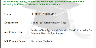 CIE Dept. invites all faculty, researchers, and students to MS Thesis Defense on "Design of Intelligent and Adaptive LVAD Controller for Diastolic Heart Failure Patients" by Mr. Ashhad Ali Shahid, a Graduate Student of CIE Dept.