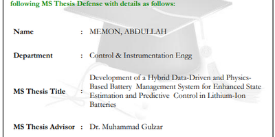CIE Dept. invites all faculty, researchers, and students to MS Thesis Defense on "Development of a Hybrid Data-Driven and PhysicsBased Battery Management System for Enhanced State Estimation and Predictive Control in Lithium-Ion Batteries" by Mr. Abdullah Memon, a Graduate Student of CIE Dept.