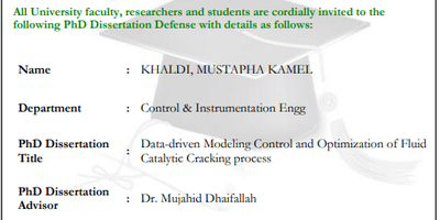 CIE Dept. invites all faculty, researchers, and students to PhD Dissertation Defense on "Data-driven Modeling Control and Optimization of Fluid Catalytic Cracking process" by Mr. Mustapha Kamel Khaldi, a Graduate Student of CIE Dept.