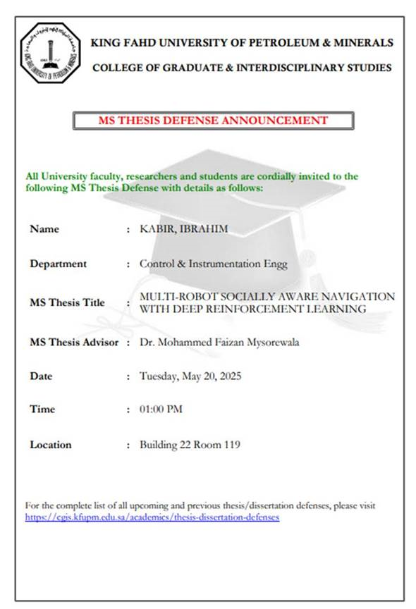 MS Defense on "Multi-Robot Socially Aware Navigation with Deep Reinforcement Learning" by Mr. Ibrahim Kabir