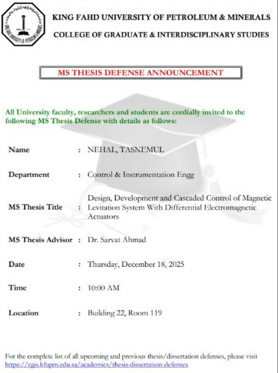 MS Thesis Defense on " Design, Development and Cascaded Control of Magnetic Levitation System with Differential Electromagnetic Actuators" by Mr. Tasneemul Nehal, a Graduate Student of CIE Dept.