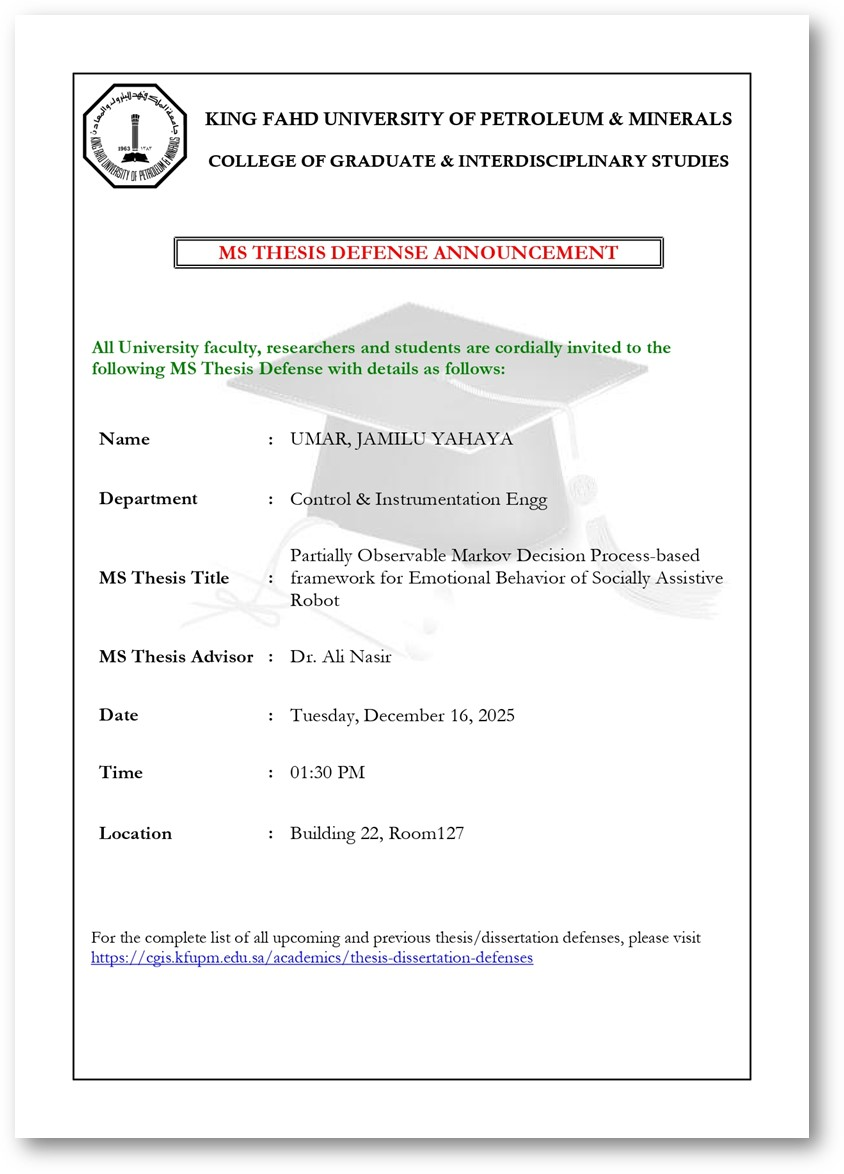 MS Thesis Defense on "Partially Observable Markov Decision Process-Based Framework for Emotional Behavior of Socially Assistive Robot" by Mr. Jamilu Yahaya Umar, A Graduate Student of CIE Dept.