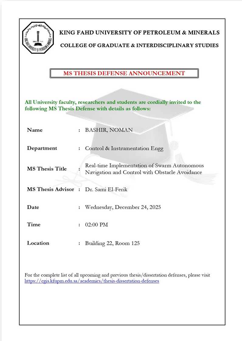 MS Thesis Defense on "Real-Time Implementation of Swarm Autonomous Navigation and Control with Obstacle Avoidance" by Mr. Noman Bashir, a Graduate Student of CIE Dept.