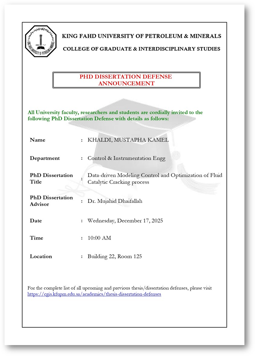 PhD Dissertation Defense on "Data-driven Modeling Control and Optimization of Fluid Catalytic Cracking process" by Mr. Mustapha Kamel Khaldi, a Graduate Student of CIE Dept.