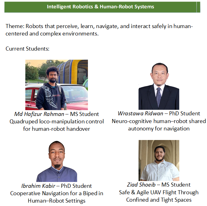 - Ibrahim Kabir (May 2025) – Intelligent Robotics & Human–Robot Systems. M.S. Thesis: Multi-Robot Socially Aware Navigation with Deep Reinforcement Learning. Current: Ph.D. Student, Systems and Control Engineering, KFUPM.